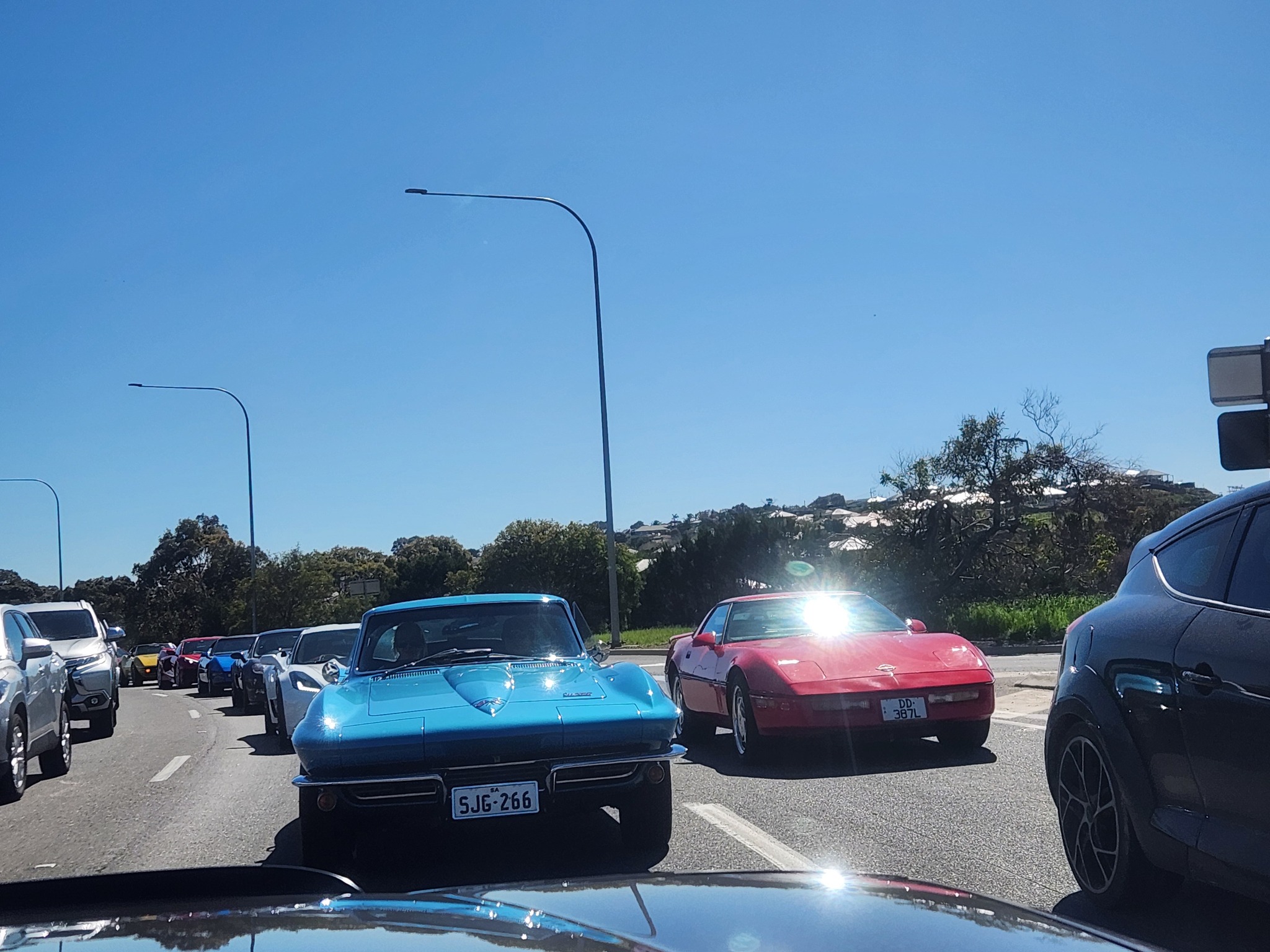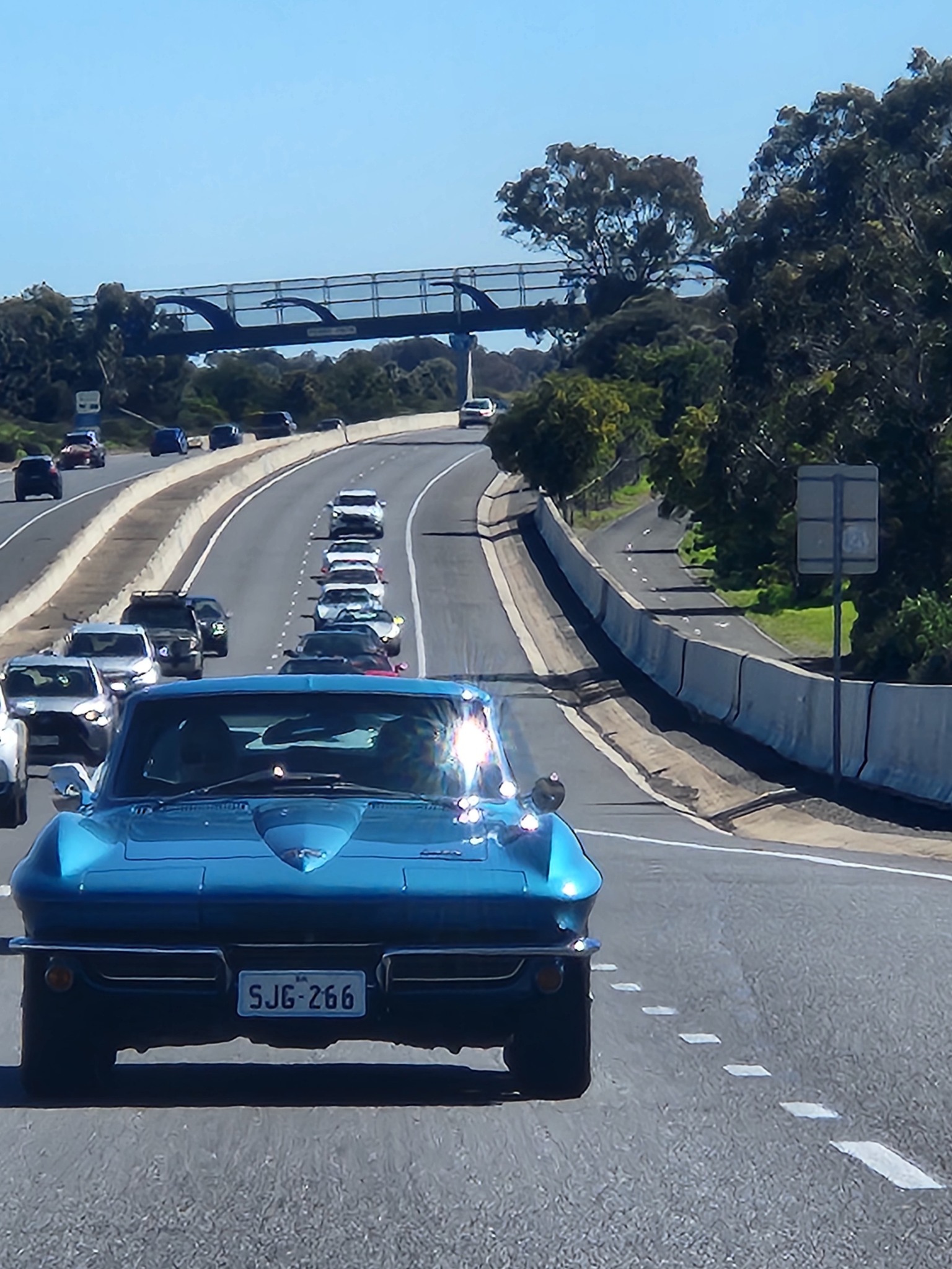 Now the plan was to have a run that we could stick to the speed limit and give the cars a good run, until we got just past the Roseworthy College, they were rebuilding the road â no black stuff- crap- I have driven that road hundreds of times no need to do a pre run recy - good thing the speed limit was VERY low as 19 Corvettes and a few daily drivers crawled, what seemed like forever, and then newly surfaced black stuff at the same speed â now at this rapid rate the 60-60 air conditioning doesnât work real well but you get time to look at the scenery.